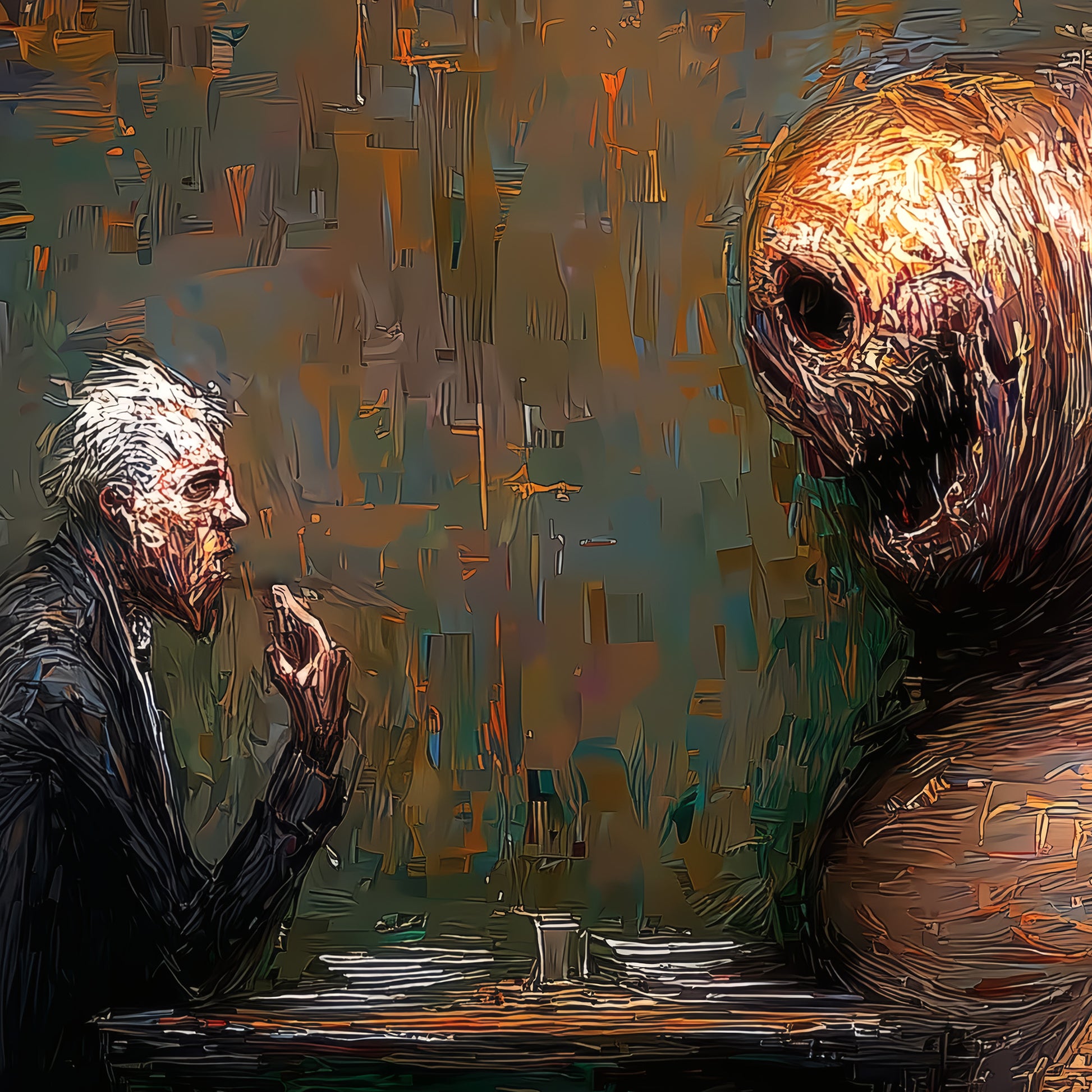 The atmospheric painting-style artwork depicts a haunting dinner scene where reality blurs with nightmare. A suited gentleman shares a meal with a towering, otherworldly creature across a weathered table. The textured brushwork and moody color palette of deep teals, burnt oranges, and shadowy blacks create an almost dreamlike quality that draws you in.