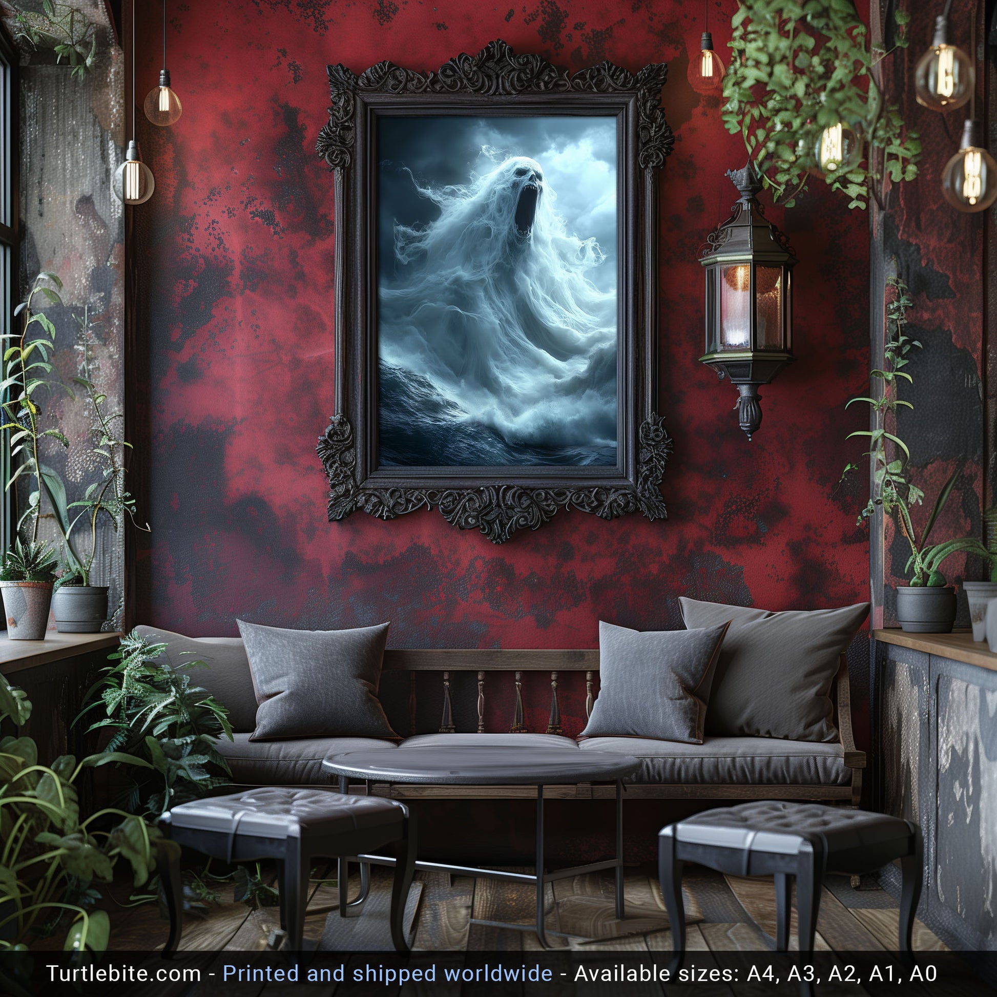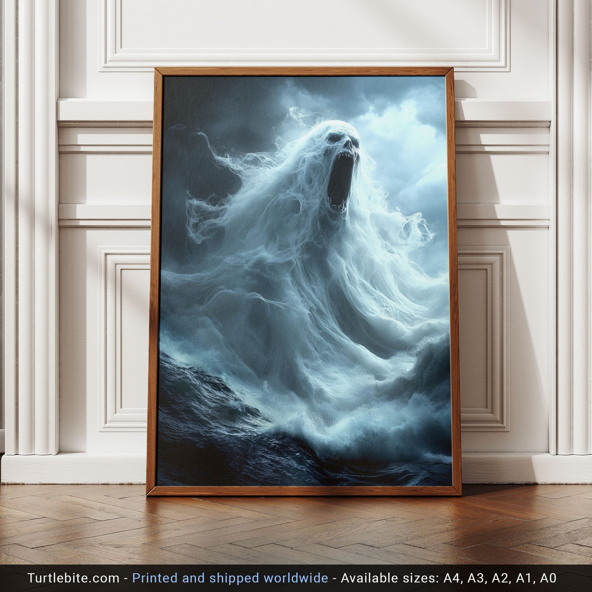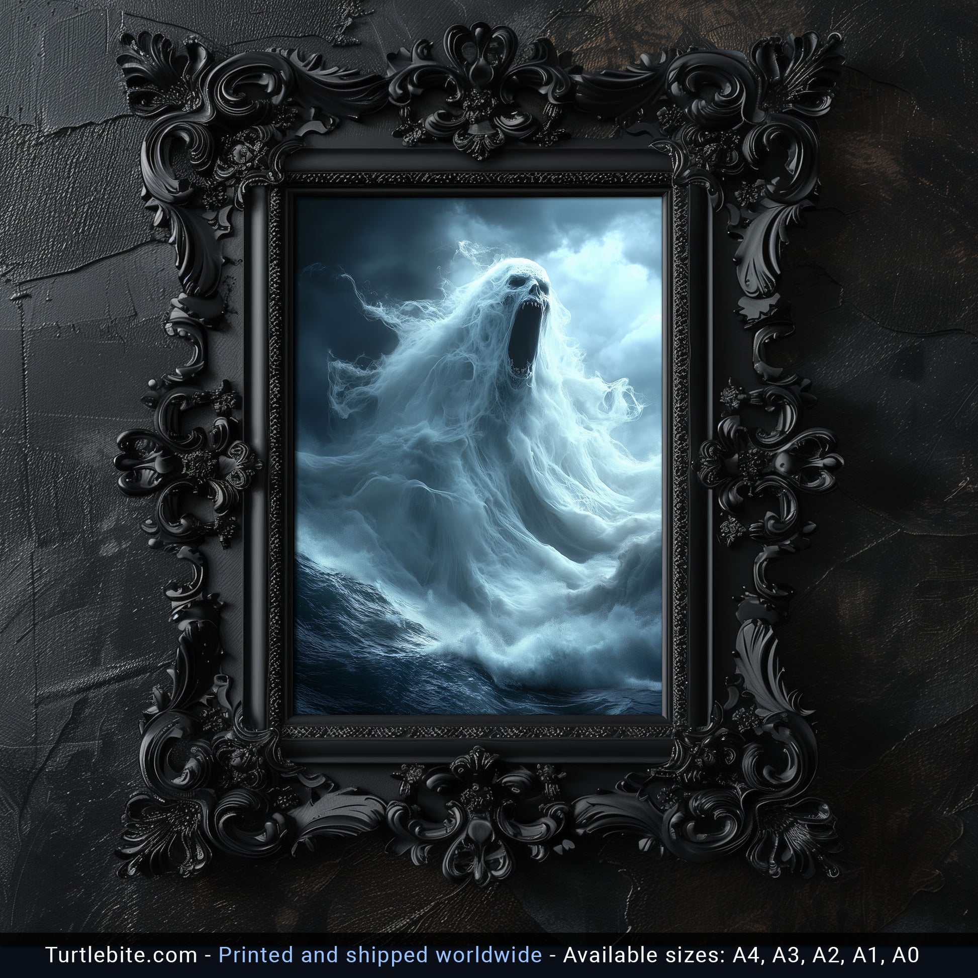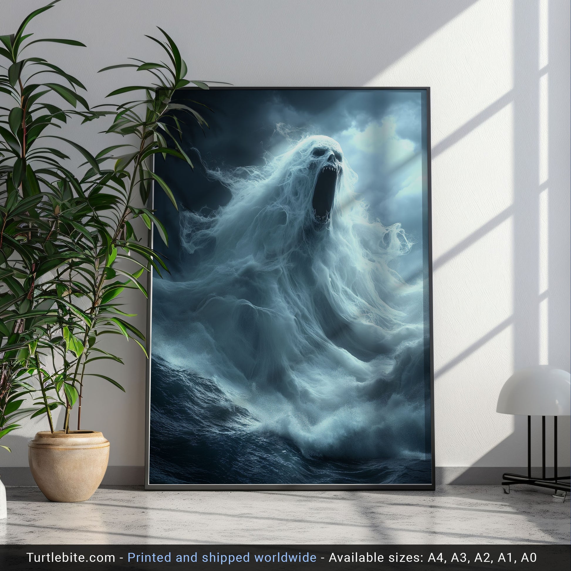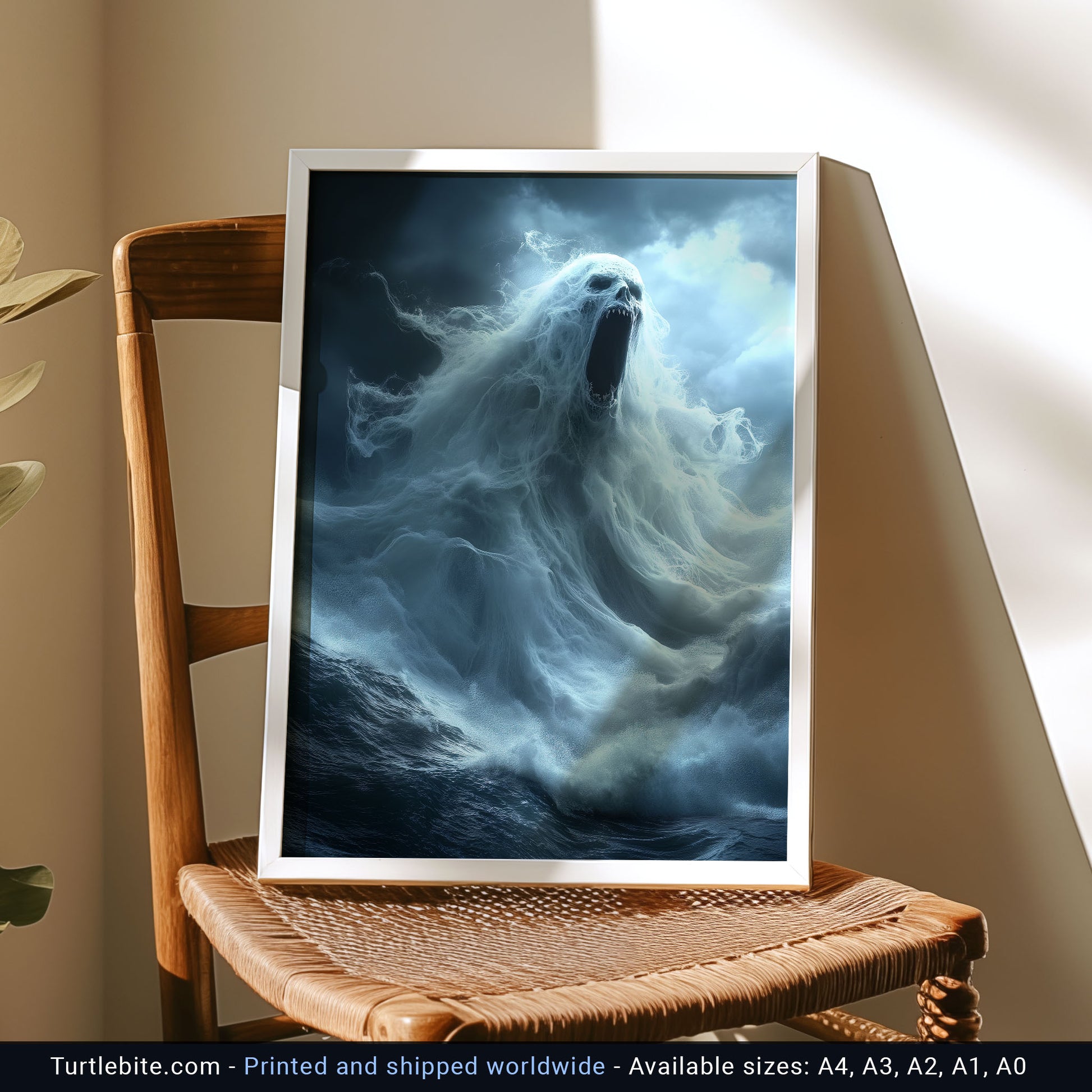 Unleash the power of the supernatural with this haunting ocean ghost poster print featuring a spectral sea spirit roaring through stormy waters. Perfect for fans of dark fantasy, horror decor, and eerie atmospheric art