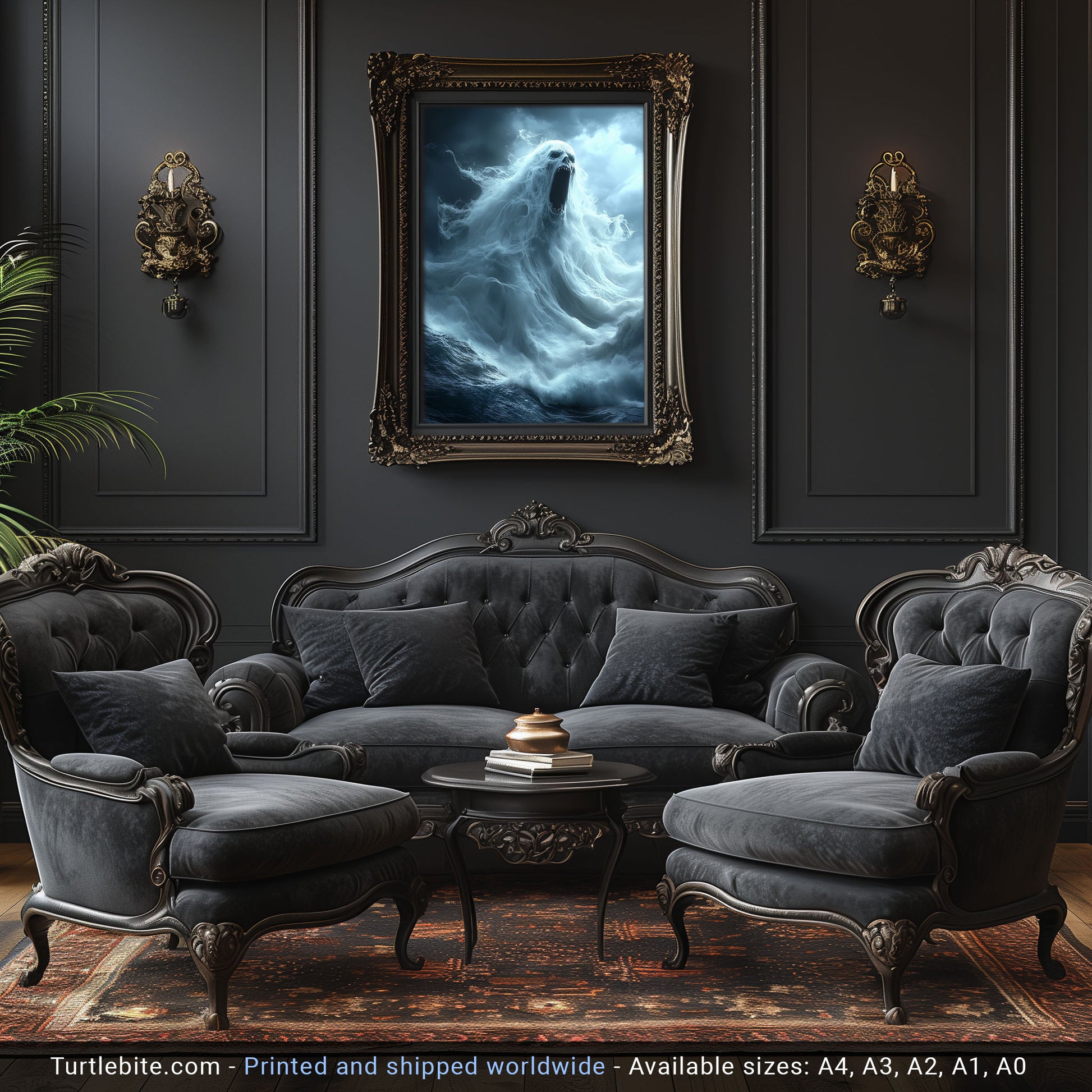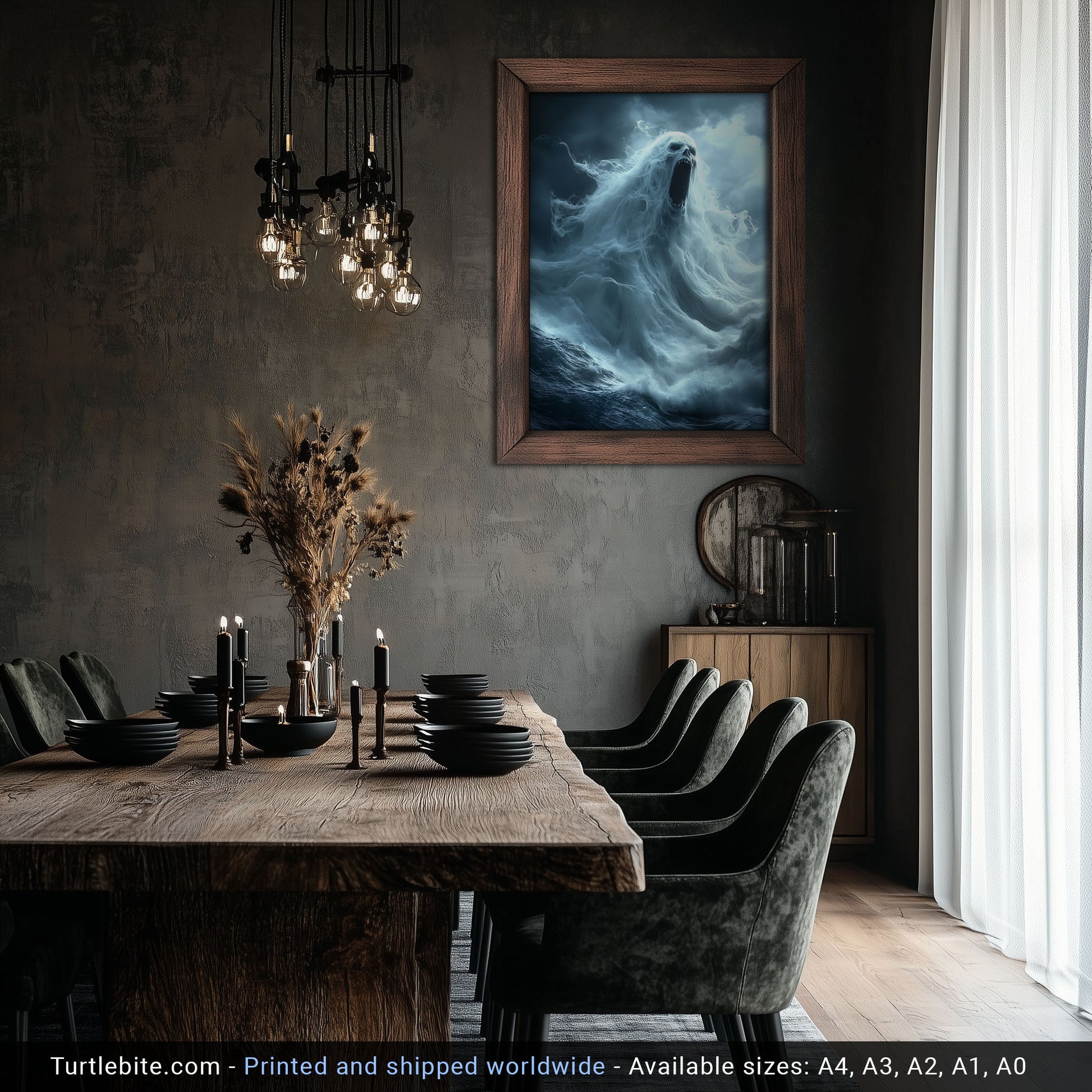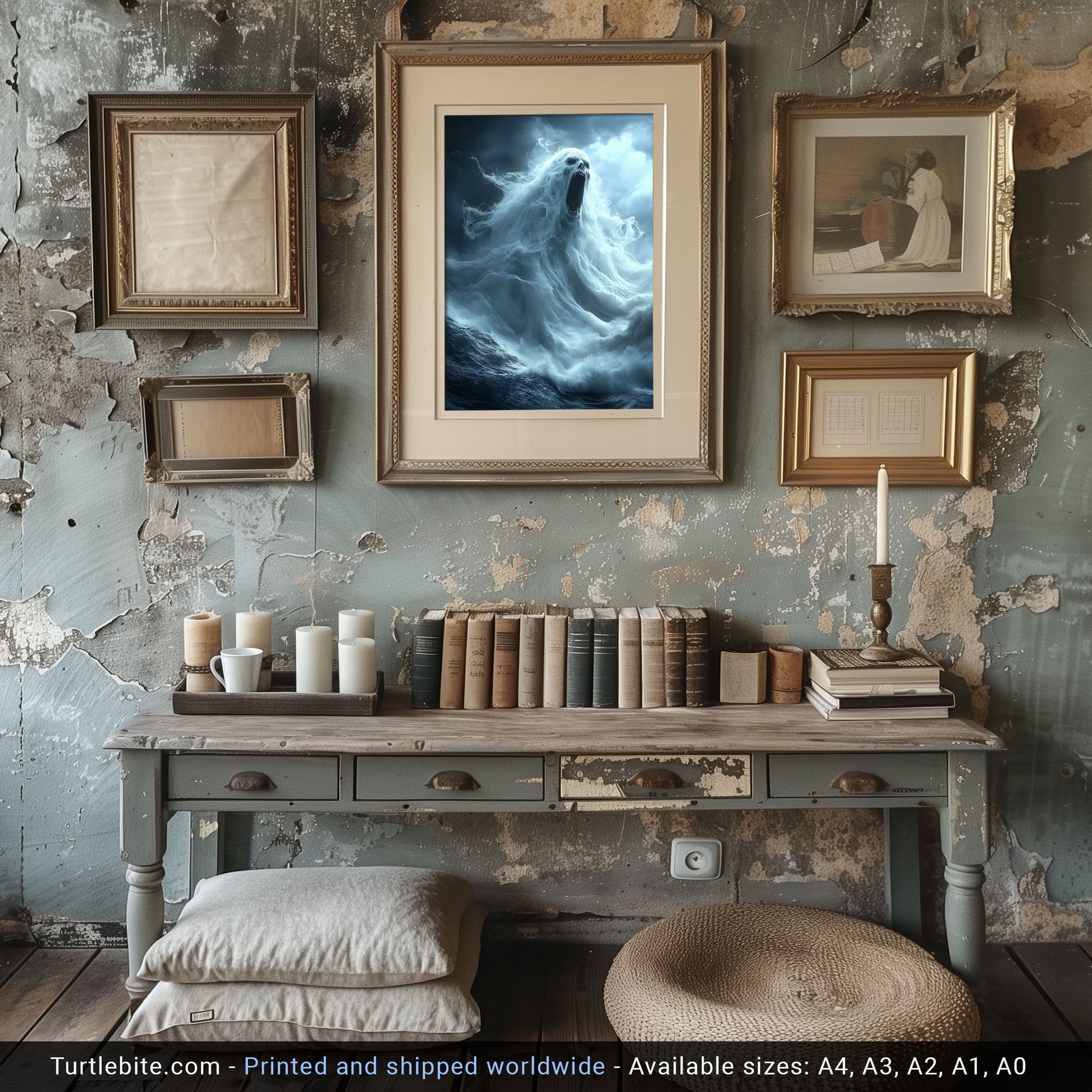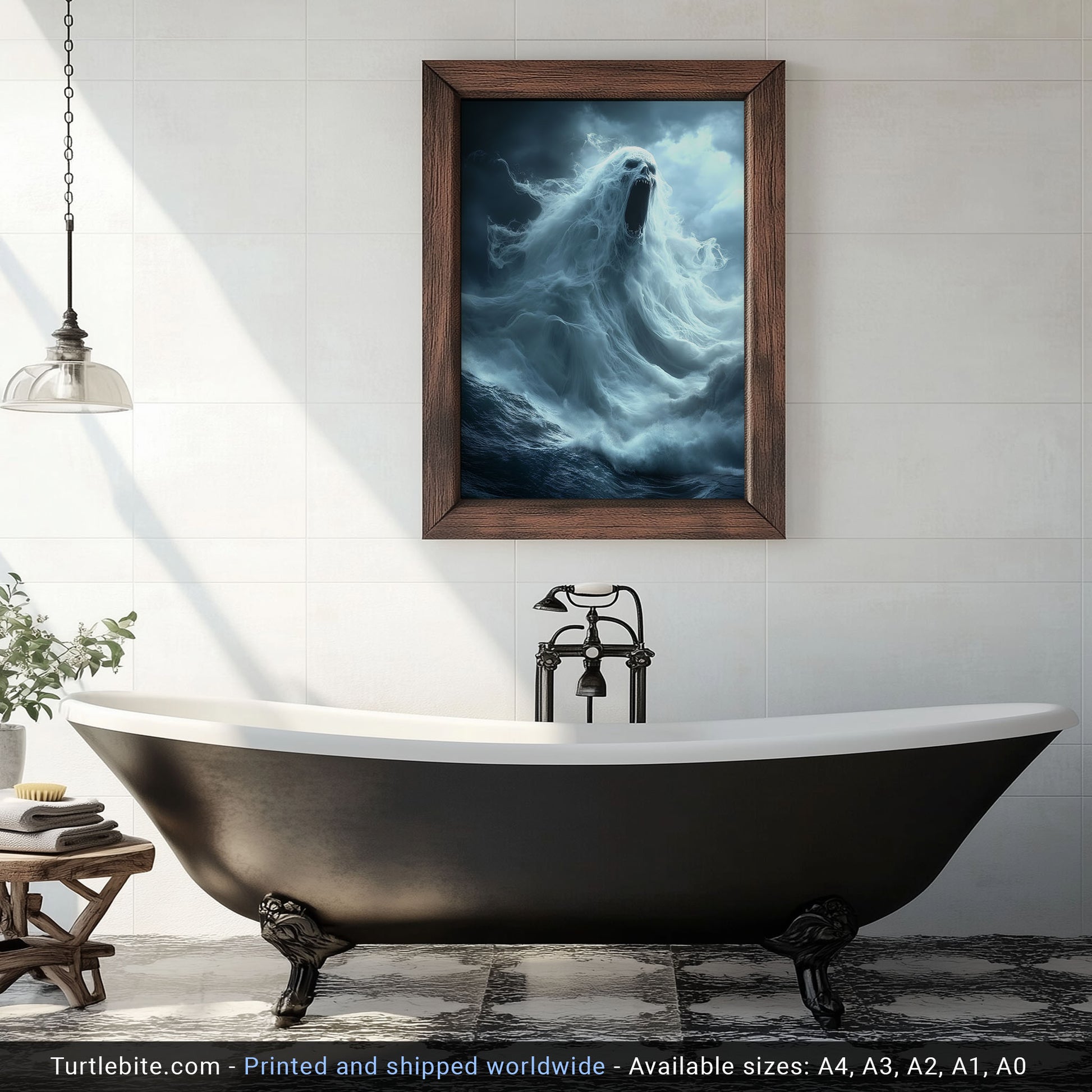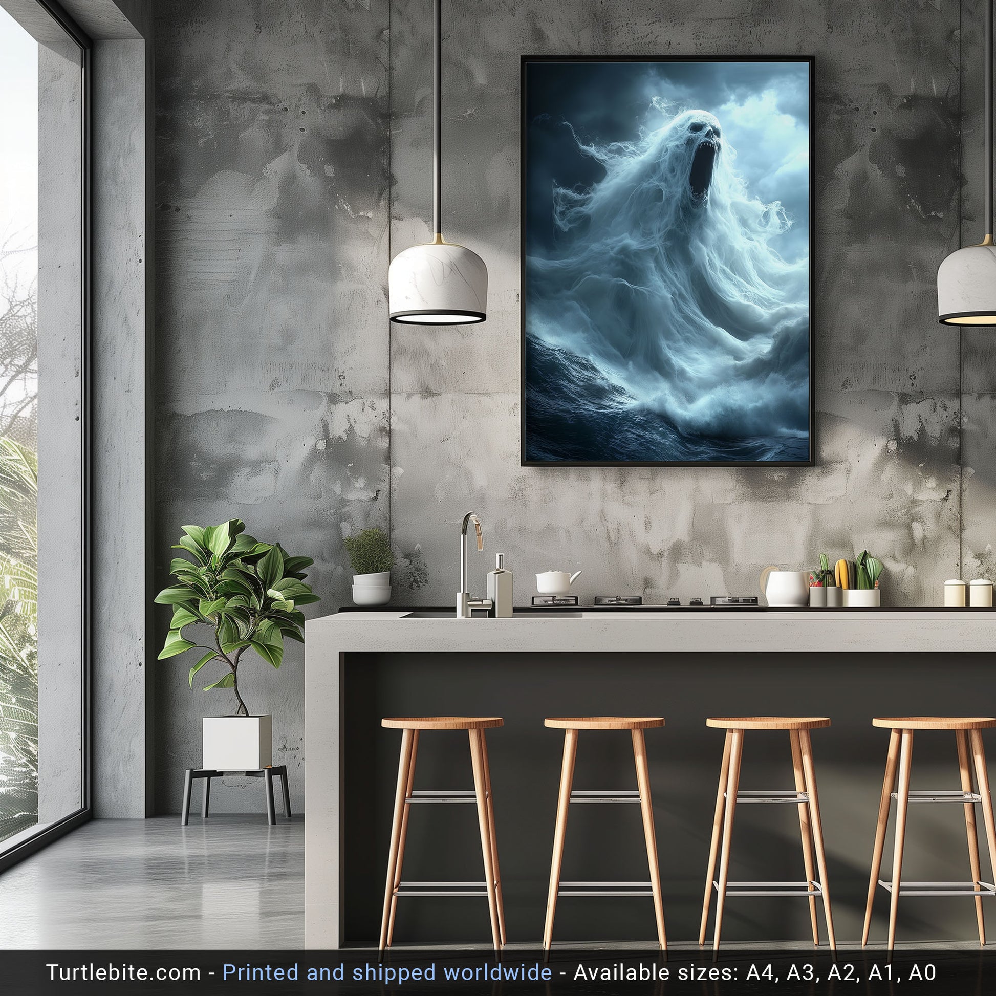 Unleash the power of the supernatural with this haunting ocean ghost poster print featuring a spectral sea spirit roaring through stormy waters. Perfect for fans of dark fantasy, horror decor, and eerie atmospheric art