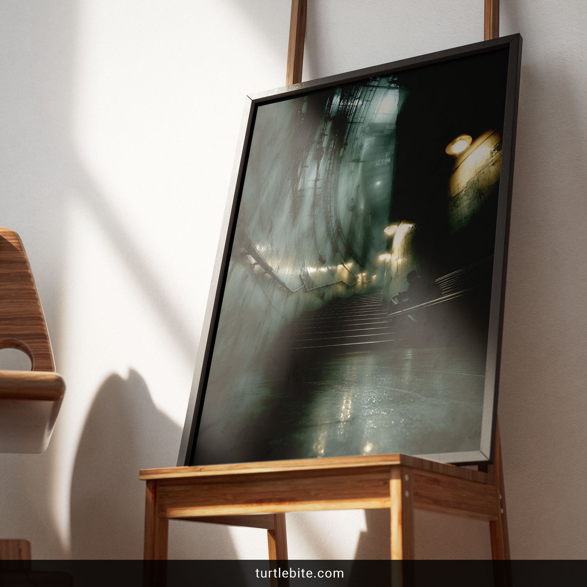 The scene unfolds in an industrial underpass where weathered walls tell stories and warm lamplight cuts through the atmospheric haze. A lone figure rests on rain-slicked stairs beneath towering pipes and infrastructure, creating that perfect melancholic vibe that dark art lovers crave. The moody teal and green tones give it an almost dystopian quality, while the wet reflections add depth and drama.