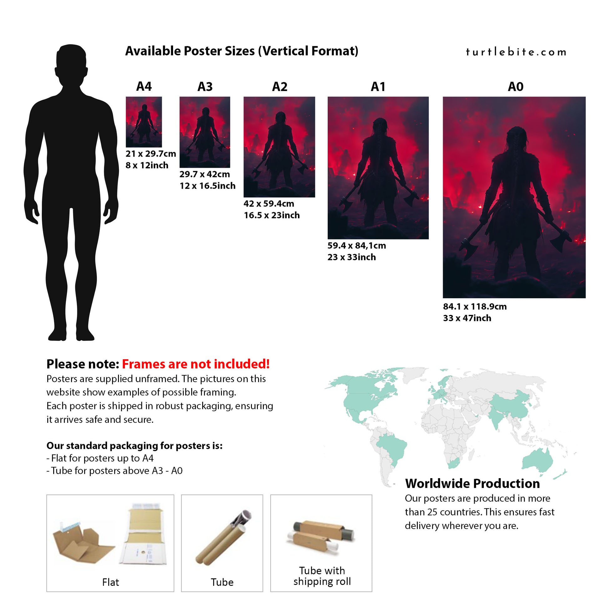 Different packaging depending on the size of the poster as well as the country where the item is produced and shipped to. Larger prints are carefully rolled and shipped in a tube, without framing included. Each of these products is crafted specifically for you upon ordering, so please allow a bit more time for delivery.