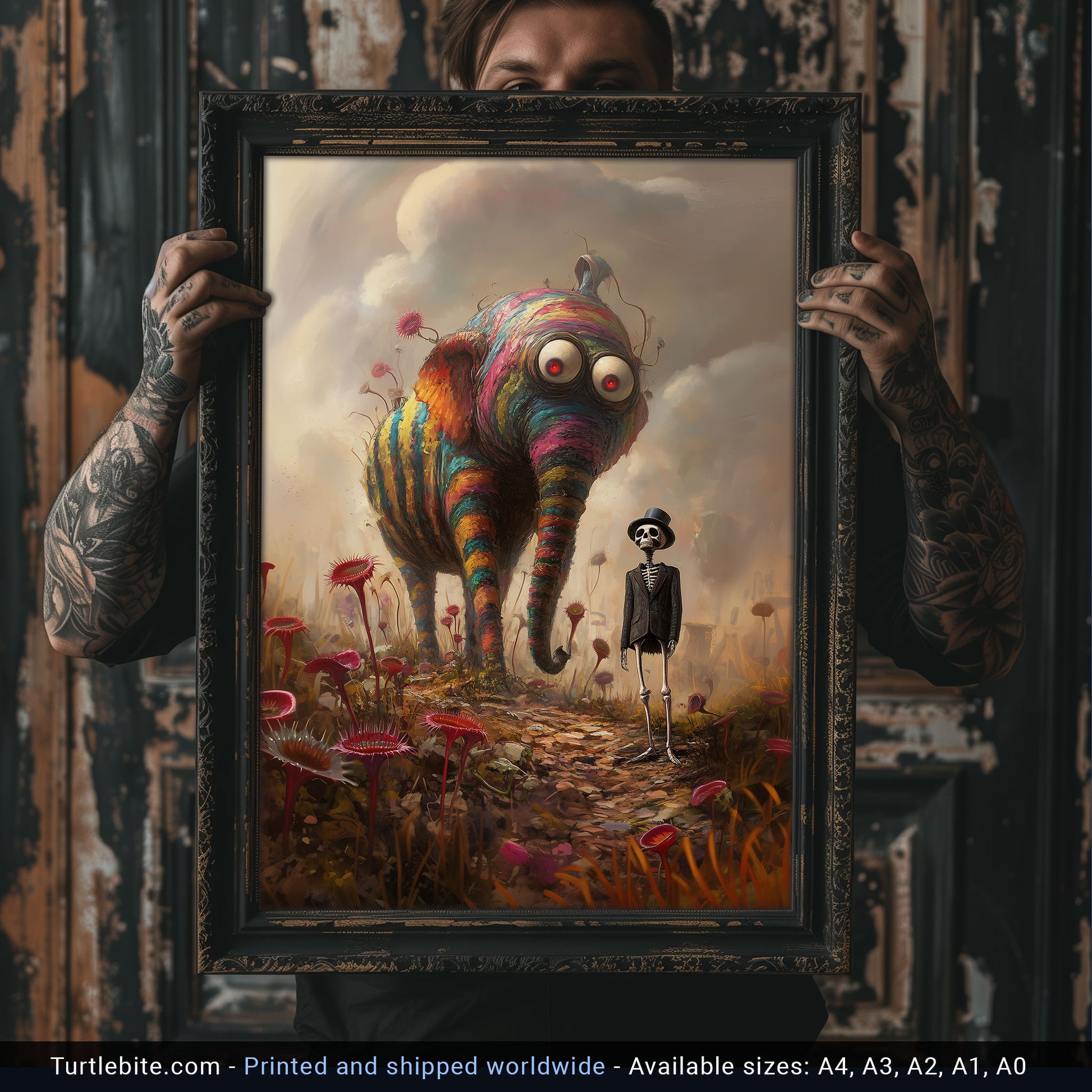 Step into a fantastical dreamscape with this surreal art print featuring a rainbow-striped elephant and a dapper skeleton guide. Perfect for lovers of whimsical, imaginative, and psychedelic artwork, this unique piece brings bold color and eerie charm to any space. From the glowing red eyes of the elephant to the curious landscape of alien flowers, every detail invites closer inspection and sparks conversation. Printed on high-quality paper, poster adds a bold pop of surrealism to bedrooms, studios, or eclectic galleries. Ideal as a gift for fantasy art collectors, gothic decor lovers, or anyone craving something truly out of this world. Let your walls tell a story that’s equal parts bizarre, beautiful, and unforgettable.