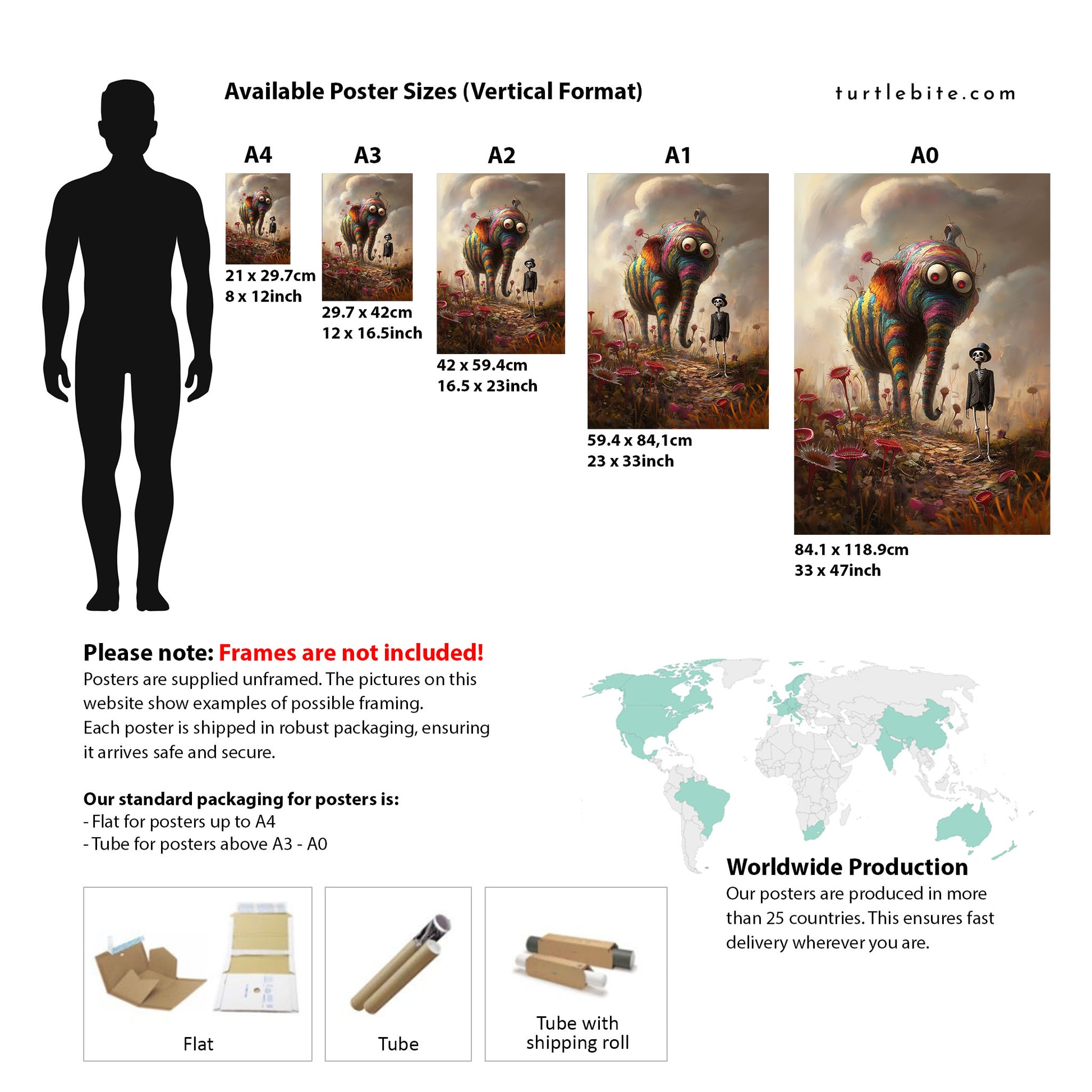Different packaging depending on the size of the poster as well as the country where the item is produced and shipped to. Larger prints are carefully rolled and shipped in a tube, without framing included. Each of these products is crafted specifically for you upon ordering, so please allow a bit more time for delivery.