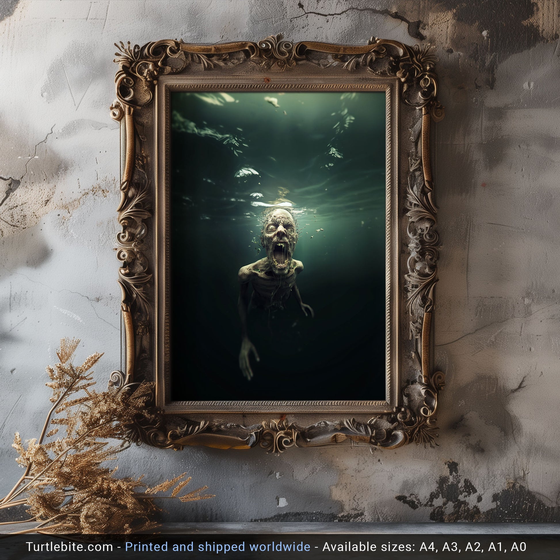 Ready to give your guests nightmares? This zombie art piece captures the terrifying beauty of the undead lurking beneath dark waters.