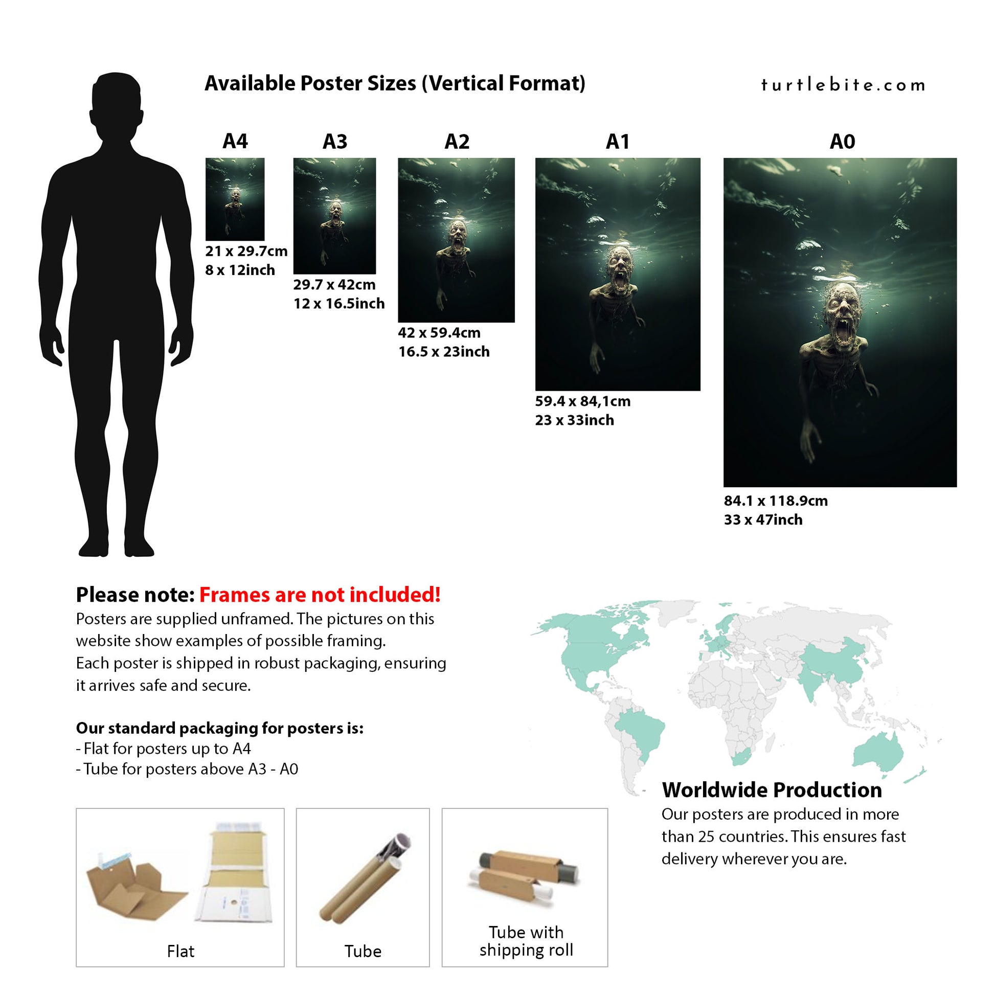 Different packaging depending on the size of the poster as well as the country where the item is produced and shipped to. Larger prints are carefully rolled and shipped in a tube, without framing included. Each of these products is crafted specifically for you upon ordering, so please allow a bit more time for delivery.